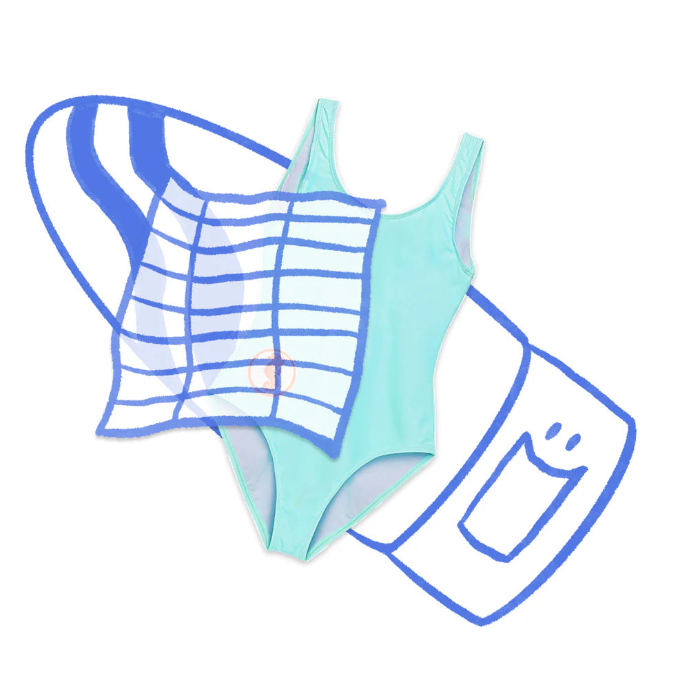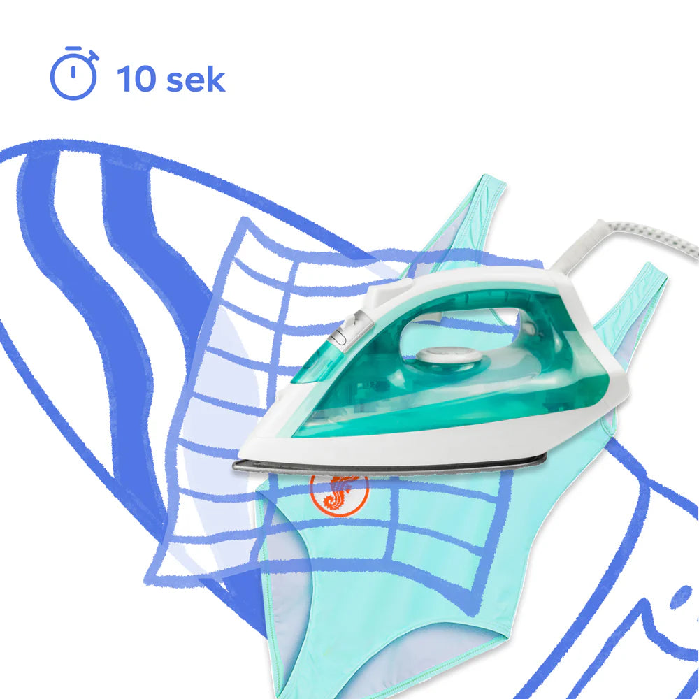Legen Sie das Abzeichen an der gewünschten Stelle auf das Bade-Textil. Achten Sie dabei auf eine gerade Position, denn nach dem Fixieren lässt es sich nicht mehr verschieben.